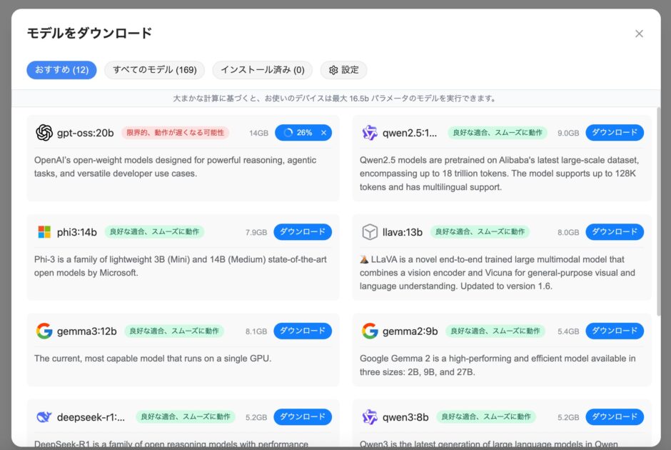 - 大規模で高性能 → gpt-oss:20b、gemma3:12b