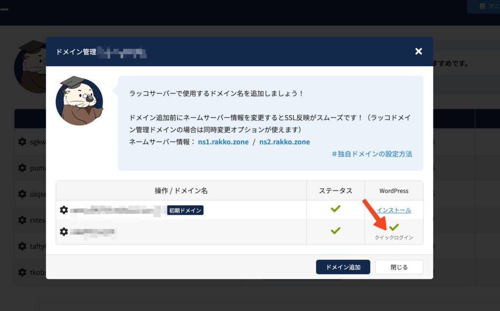 ラッコサーバーの管理画面には、「クイックログイン」というボタンがあります。これをクリックするだけで、IDやパスワードを入力することなく、一発で自分のWordPress管理画面にログインできます。